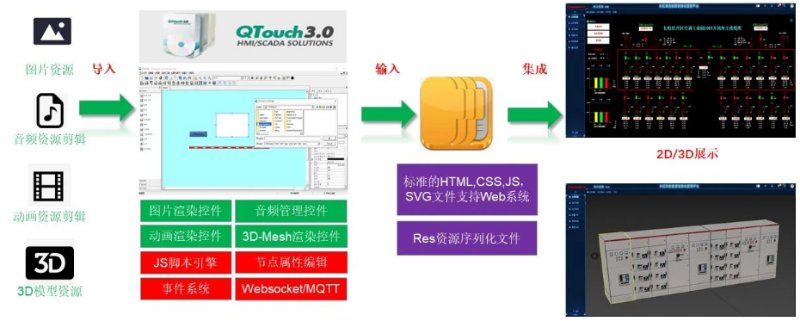 4、QTouch 2D/3D编辑设计工具:大屏设计、2D/3D编辑设计、及导出到SVG及3D的obj模块功能;