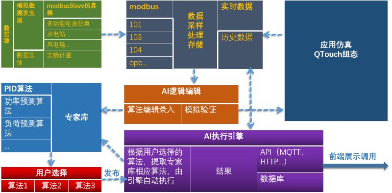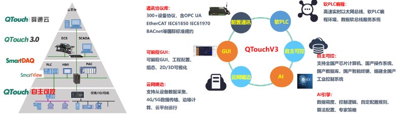 QTouch软件采用自主可控跨平台技术底座,面向PLC、HMI、PAC提供HMI/SoftPLC实时控制系统模块;面向DCS、SCADA提供边缘计算SCADA模块;面向云平台应用提供“四维一体”的云组态、高安全加密传输、流数据存储及人工智能专家决策服务。