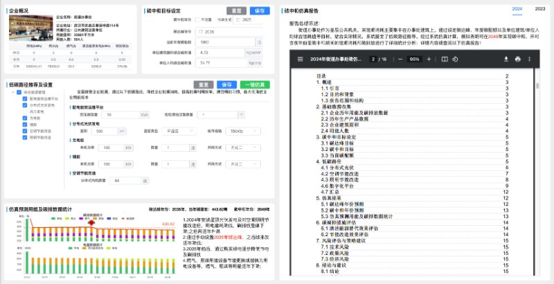 平台凭借强大的碳中和仿真模拟功能,为企业或园区的碳排放场景进行准确模拟预测,精心绘制碳中和路线图,提供专业的碳中和路径建议。企业可借此提前规划碳中和战略,在低碳转型的浪潮中稳占先机,驶向绿色未来的彼岸。