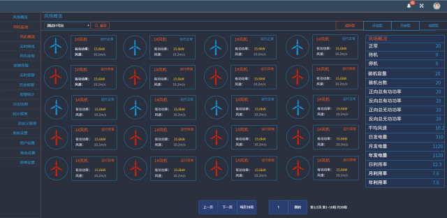 1)风场概览:可以通过矩阵型、环线型、列表型、地图行四种模式查看整个风场的运行状态