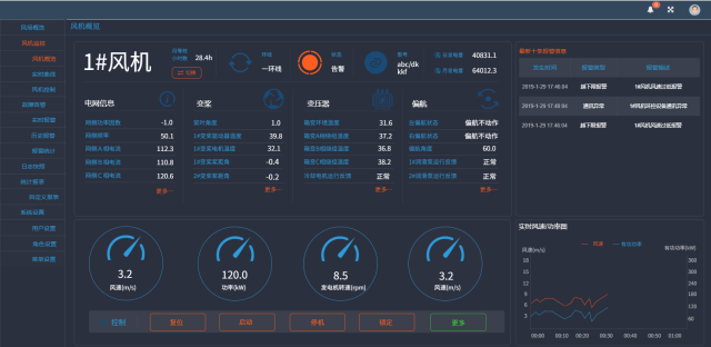 3)风机控制:可以进行整个风场、单个环线、单个风机、多个风机集中模式的控制操作