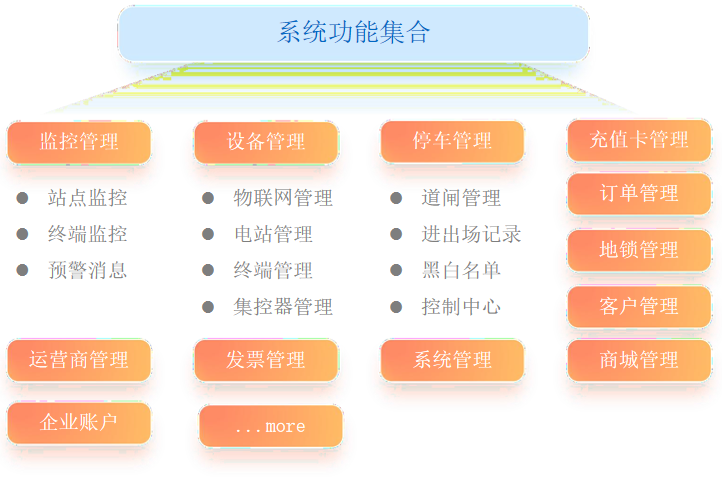 系统设置一级模块共计:10,二级模块共计:30余项,平台总计90余项功能,其中基础模块包括:系统管理、综合管理、档案管理、智能运维、充电监控。系统提供包括:PC、APP、小程序等多种访问方式,并提供短信、语音报警提示。可根据用户的需求,将功能进行分散组合,以满足不同的应用场景。如:光伏+储能+充电等