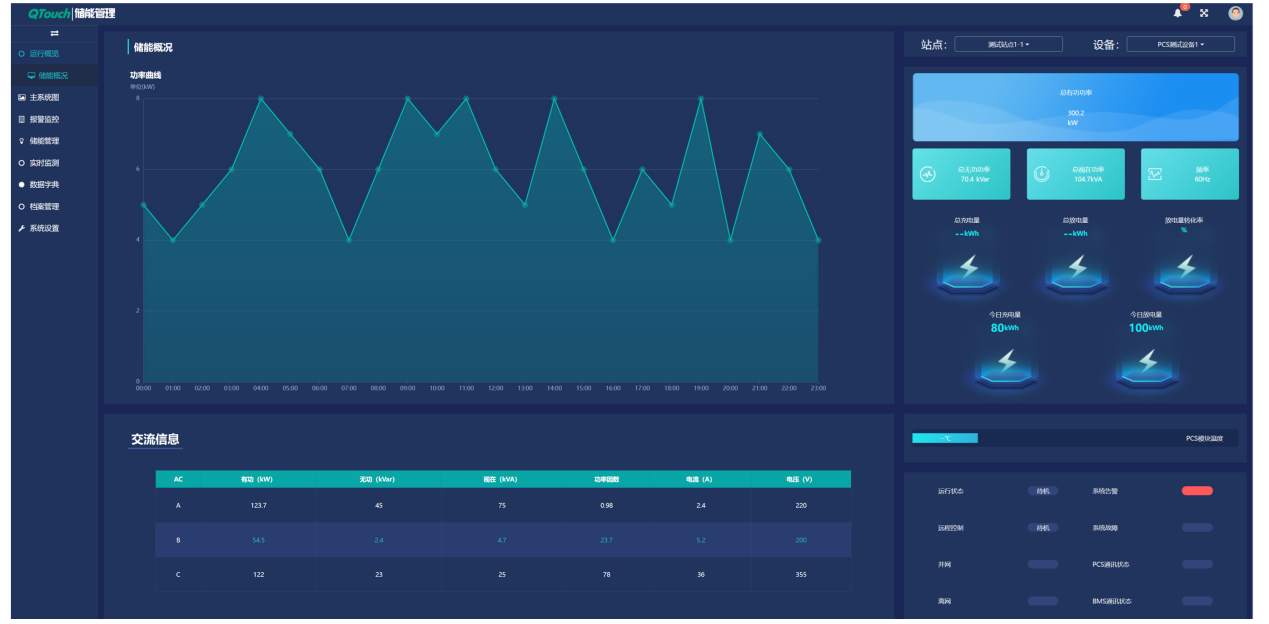 (1)全景式数字化监测:基于可视化展示技术,对储能电站的关键设备、关键参数实施多方位、多样式监测及展示,洞悉电站细节,随时随地掌握电站运行情况。