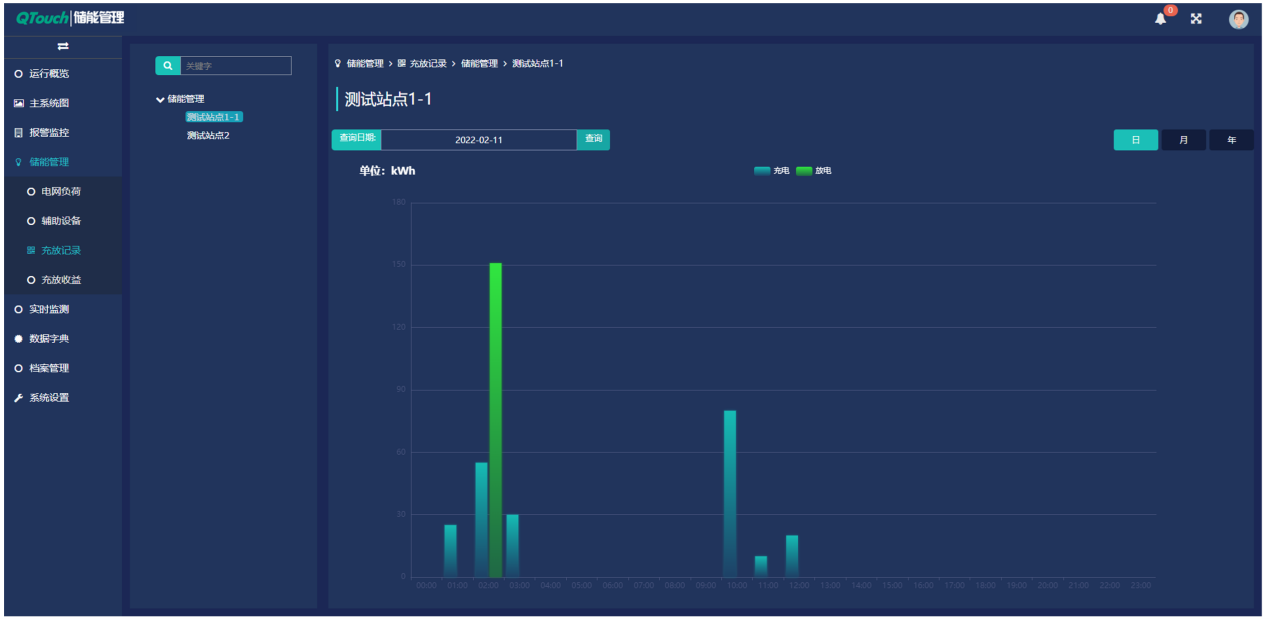 按时间维度,统计充放电量,直观反馈充放变化频率、时段、电量等信息: