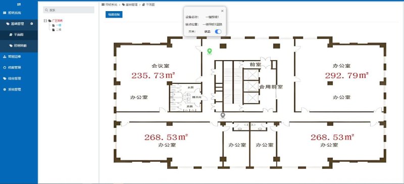 跟进楼层空间结构,照明回路针对各个位置进行回路摆放。点击照明图标可以对照明回路进行监控管理。