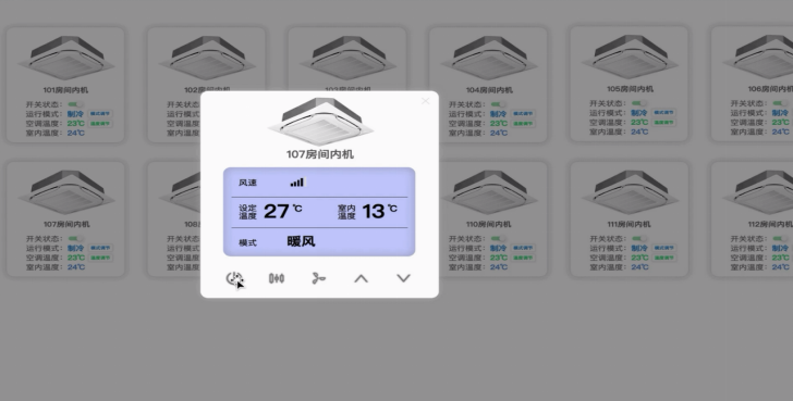 运行状态监测:实时监控每台室内机和室外机的运行状态,包括开关机状态、运行模式、风速、温度设定等。