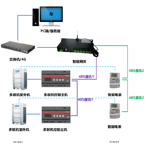 hjc黄金城集团多联机空调群控系统采用可以识别多联机室外机协议的多联机控制网关,多联机控制网关接入室外机后,可以读取所有此室外机系统内的室内机;多联机控制网关可以控制室外机和室内机,并将其的数据如当前状态、运行时长、故障代码等上传到平台;若需要电量计量时,智能网关可用第二路485通讯连接电表,从而获取每个室外机的总用电。