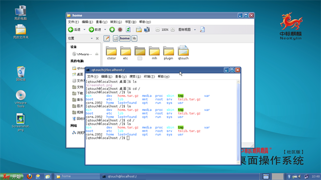 安装的中标麒麟操作系统为桌面版,默认启动为图形界面。安装完成后将home.tar.gz文件放在根目录下(系统的一级目录)
